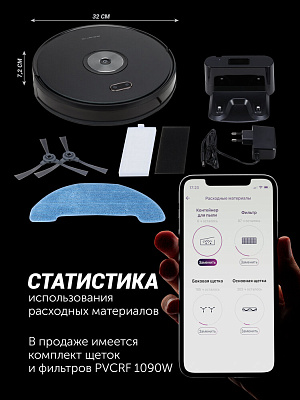 Комплектация | пылесос, контейнер для влажной уборки, зарядное устройство, адаптер, фильтр нера 2 шт, губчатый фильтр, микрофибра 2 шт, 4 боковые щетки, щеточка для очистки, пульт ду, инструкция |