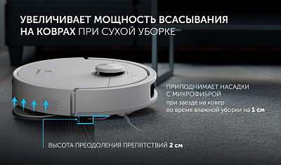 • Запрет влажной уборки на коврах: робот приподнимает насадки для влажной уборки при заезде на ковер