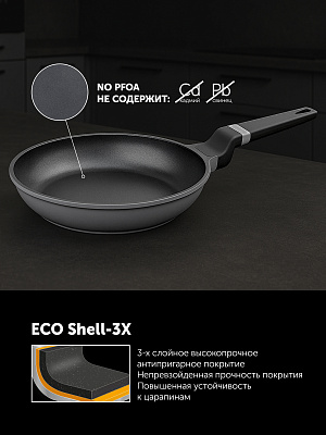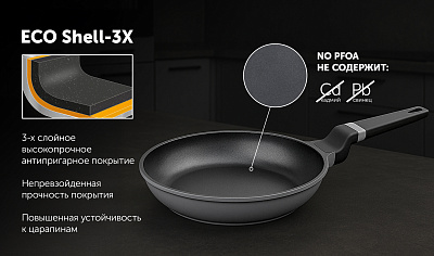 Внутреннее высокопрочное трехслойное антипригарное покрытие ECO Shell-3X без PFOA обеспечивает непревзойденную стойкость к царапинам.