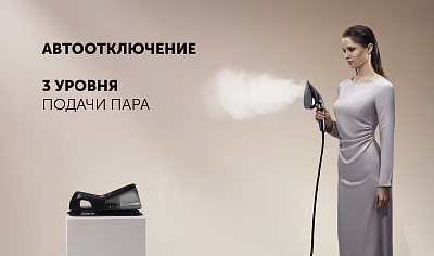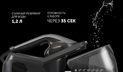 Ручной прибор может работать как отпариватель – готовность к работе составляет всего 35 секунд! Устройство помогает удалить неприятные запахи с одежды, штор, постельного белья и других тканей, делая их более мягкими и приятными на ощупь. Мощный парогенератор оснащён ёмкостью для воды объёмом 1.2 литра. В комплекте также идет мерный стакан и 2 терморукавицы.