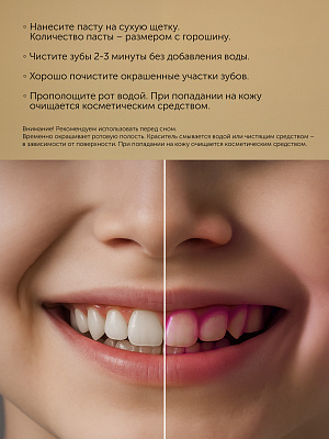 Паста содержит специальные компоненты, которые окрашивают зубной налёт в розовый цвет, что позволяет легко и точно определить участки, требующие более тщательной чистки. Это помогает предотвратить развитие кариеса и других заболеваний полости рта.