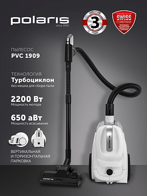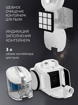 Пылесос циклонного типа с мощностью мотора 2200 Вт и мощностью всасывания 650 аВт.