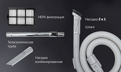 | Комплектация | пылесос, гибкий шланг, телескопическая труба, щетка для пола и ковров, комбинированная насадка, инструкция по эксплуатации |