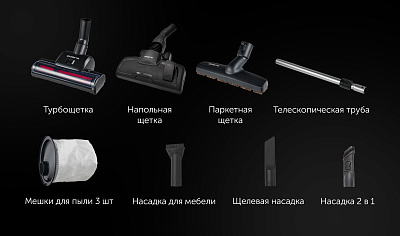 В комплекте: телескопическая труба, насадка 2в1, насадка щелевая, насадка для мебели, турбощетка для мебели и ковров, паркетная щетка, напольная щетка, мешки для пыли 3 шт.