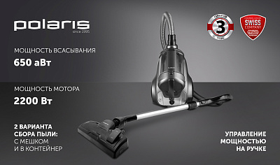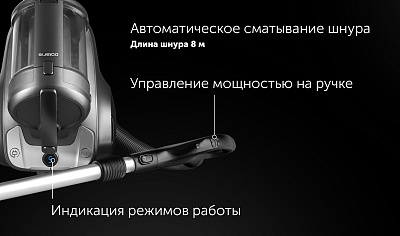 Пылесос циклонного типа с мощностью мотора 2200 Вт и мощностью всасывания 650 аВт.