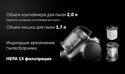 2 варианта сбора пыли: в мешок для пыли 1,7 л или в контейнер 2,0 л.