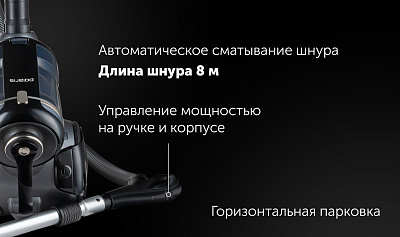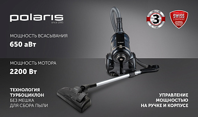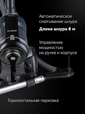 Пылесос циклонного типа с мощностью мотора 2200 Вт и мощностью всасывания 650 аВт.