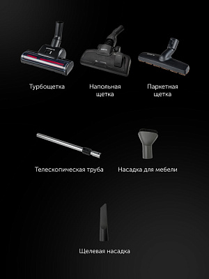 В комплекте: телескопическая труба, насадка для мебели, щелевая насадка, турбощетка для мебели и ковров, паркетная щетка, напольная щетка.